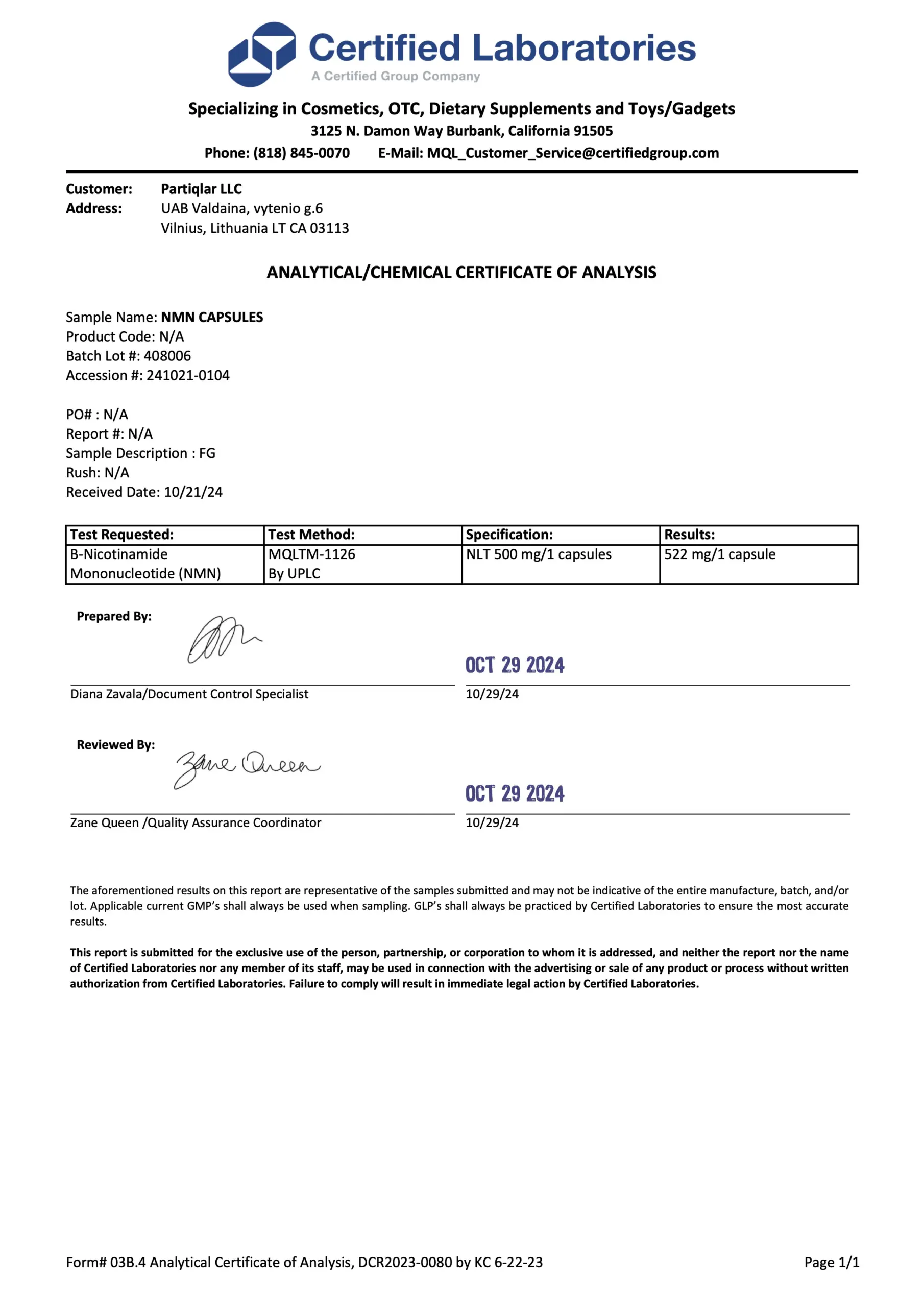 Every batch of partiQlar spermidine is third-party tested for purity, potency, and heavy metals. We also manufacture in FDA-registered, GMP-certified facilities in the U.S., with full Certificates of Analysis available on site.